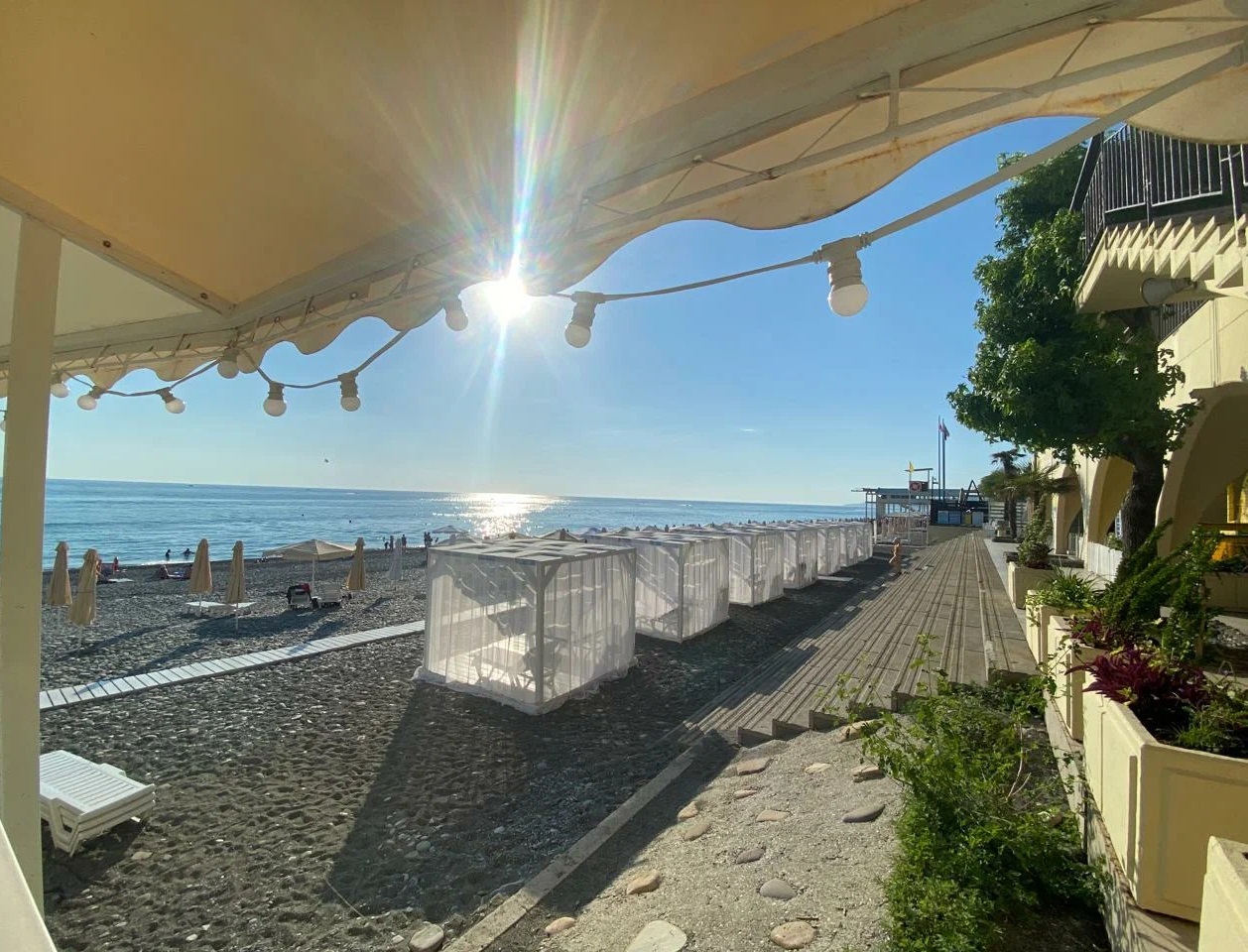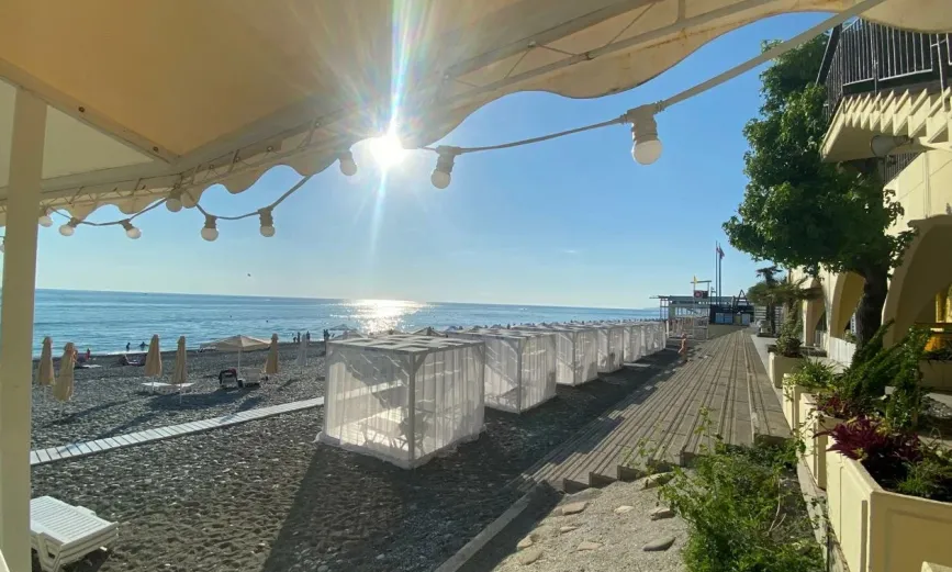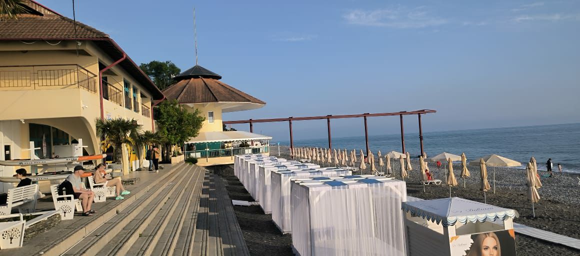 Широкий галечный пляж 1 КАТЕГОРИИ находится на расстоянии 500 метров от комплекса и оборудован всем необходимым: шезлонгами, зонтами, душевыми, раздевалками и теневыми навесами.