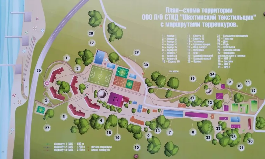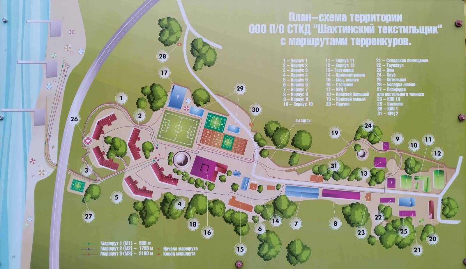 Территория пансионата площадью более 7 га прекрасно спланирована и ландшафтно-дизайнерски оформлена цветниками, кустарниками и множеством деревьев лиственных и хвойных пород, а также экзотических видов и сортов. На территории обустроены просторные тенистые отрядные места и беседки для отдыха, фонтаны, терренкуры и танцевальные площадки.