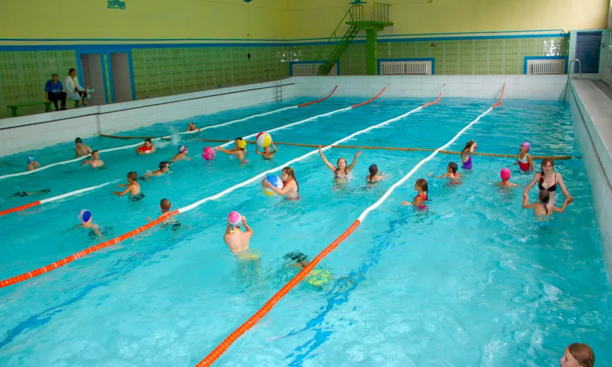 - Крытый бассейн 25м*12,5 м, 5 дорожек, разметка, глубина переходящая 1,5 м-4 м,