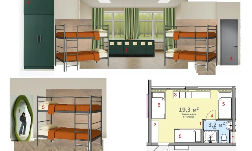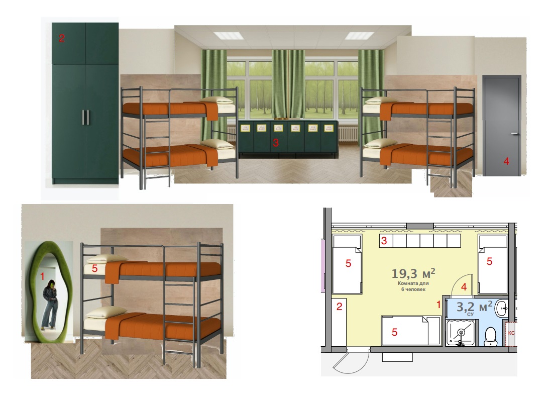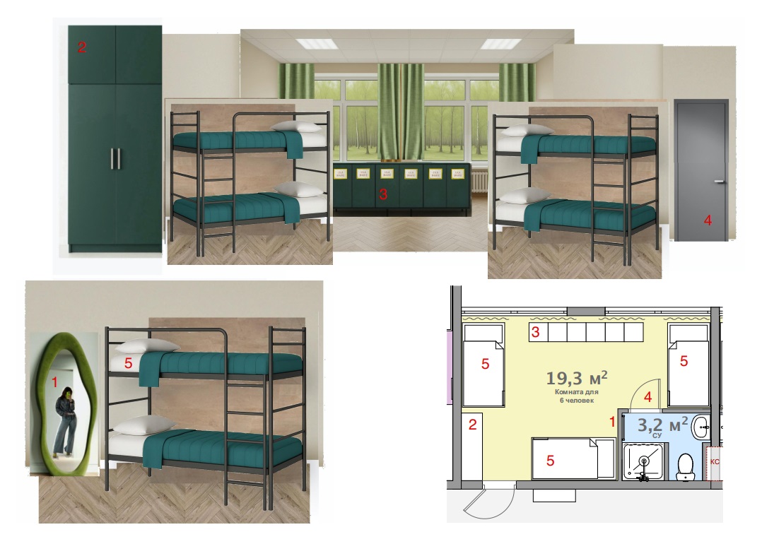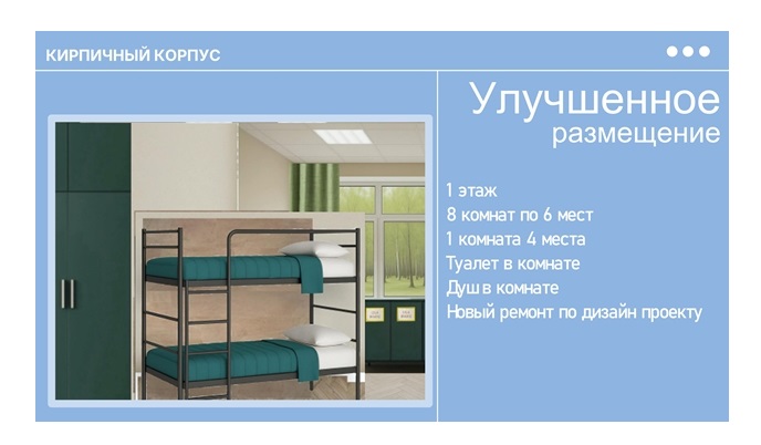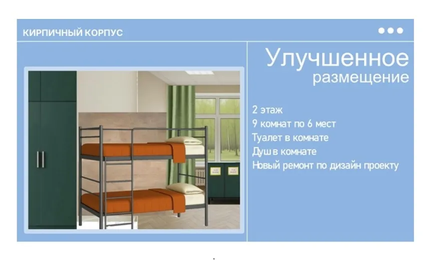 - Удобства: в каждой комнате: туалет, душ, раковина, вместительный шкаф, тумбочка, в детских комнатах кровати (двухэтажные).