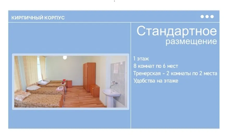 - Стандартное размещение, 2 этаж, 17 комнат по 3 места. Тренерская - 1 комната на 2 места. Удобства на этаже