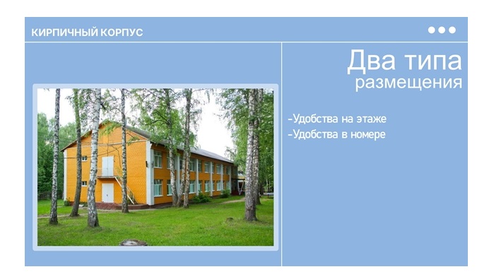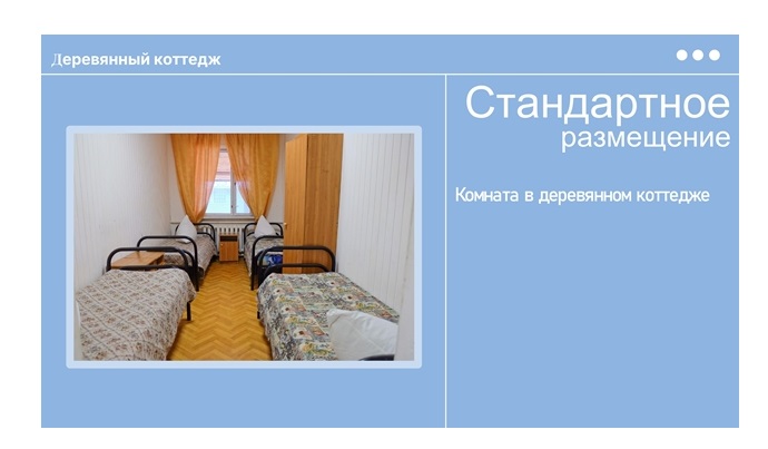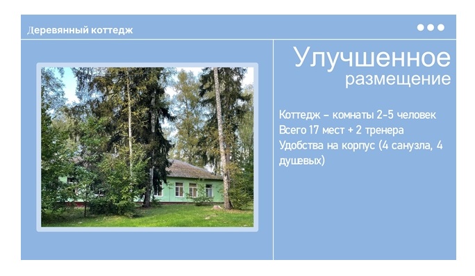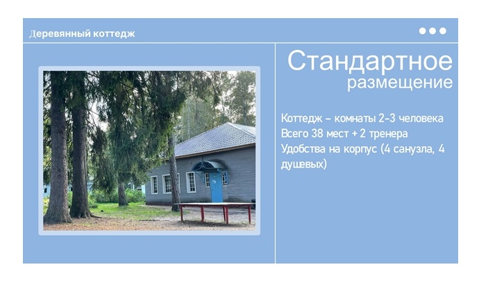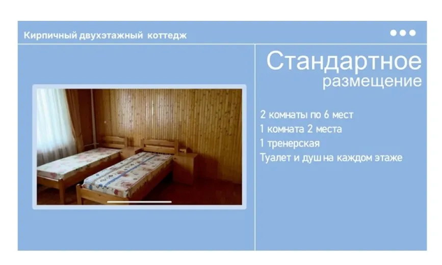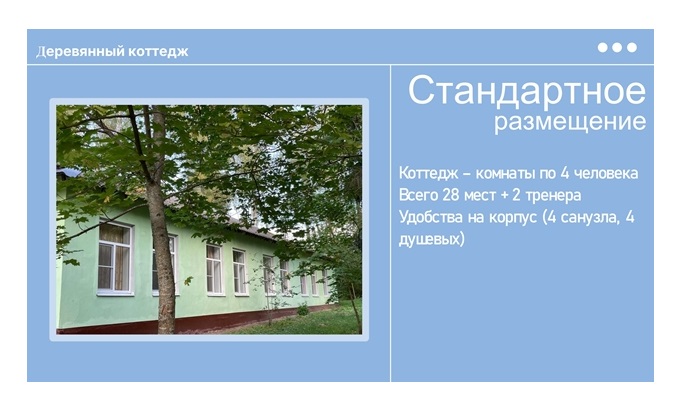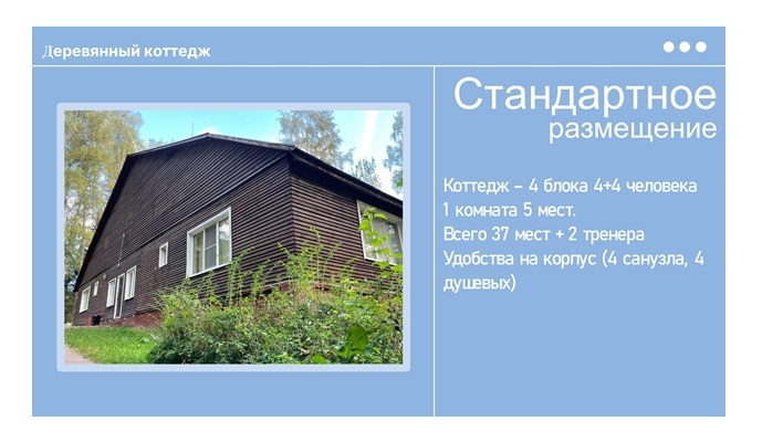 - Стандартное размещение. Коттедж – комнаты 2-3 человека. Всего 38 мест + 2 тренера. Удобства на корпус (4 санузла, 4 душевых).