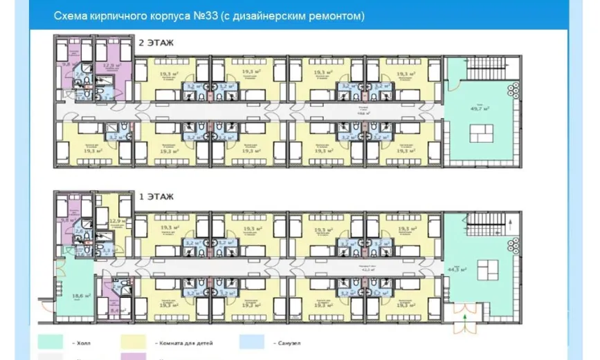 - Улучшенное размещение. 2 этаж, 9 комнат по 6 мест, туалет в комнате, душ в комнате. Новый ремонт по дизайн проекту.