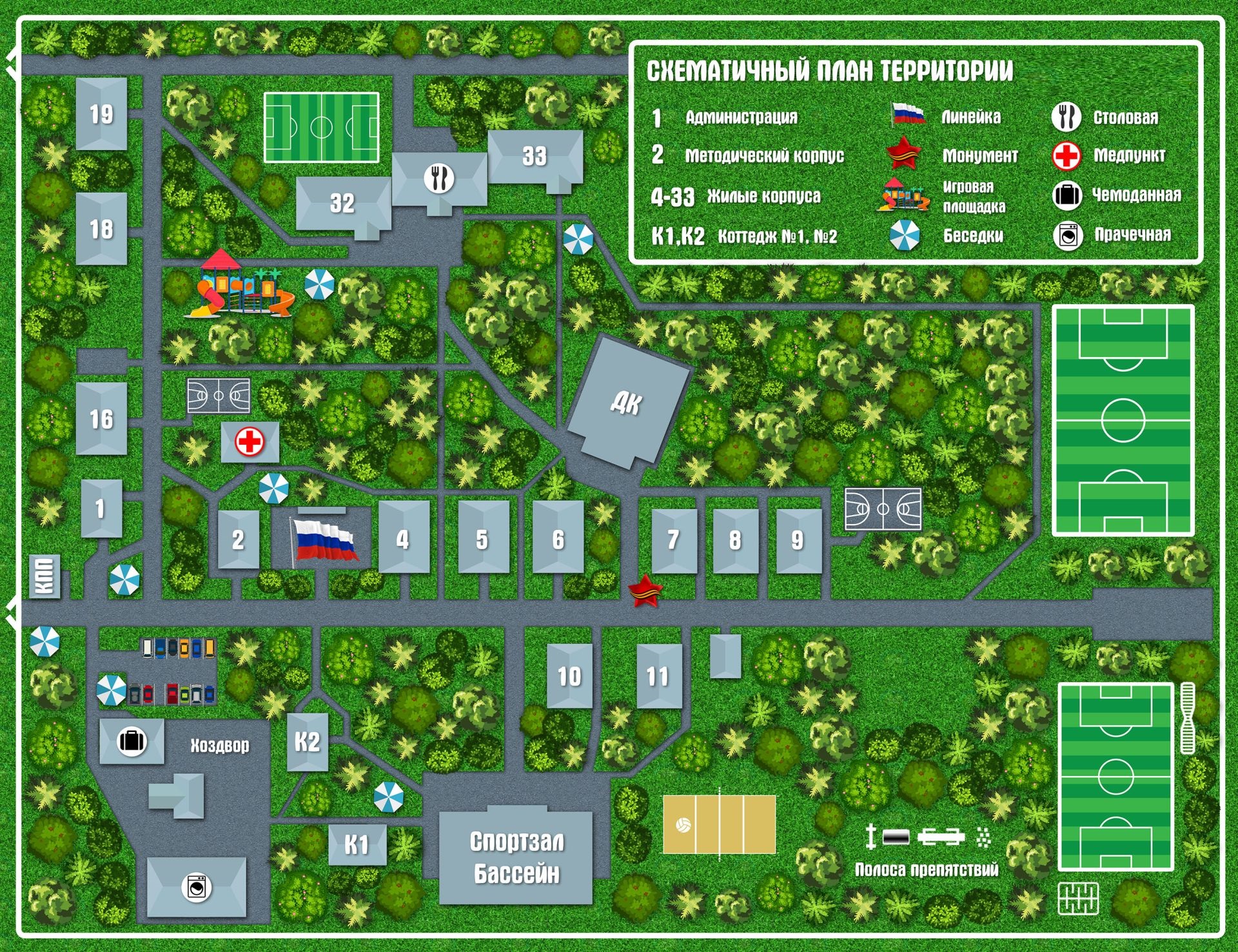 Лагерь находится вдали от трасс и предприятий, в смешанном живописном лесу. На обширной и благоустроенной территории В 15 га расположены различные спортивные площадки и досуговая инфраструктура, которая позволяет проводить тренировки практически по всем видам спорта.